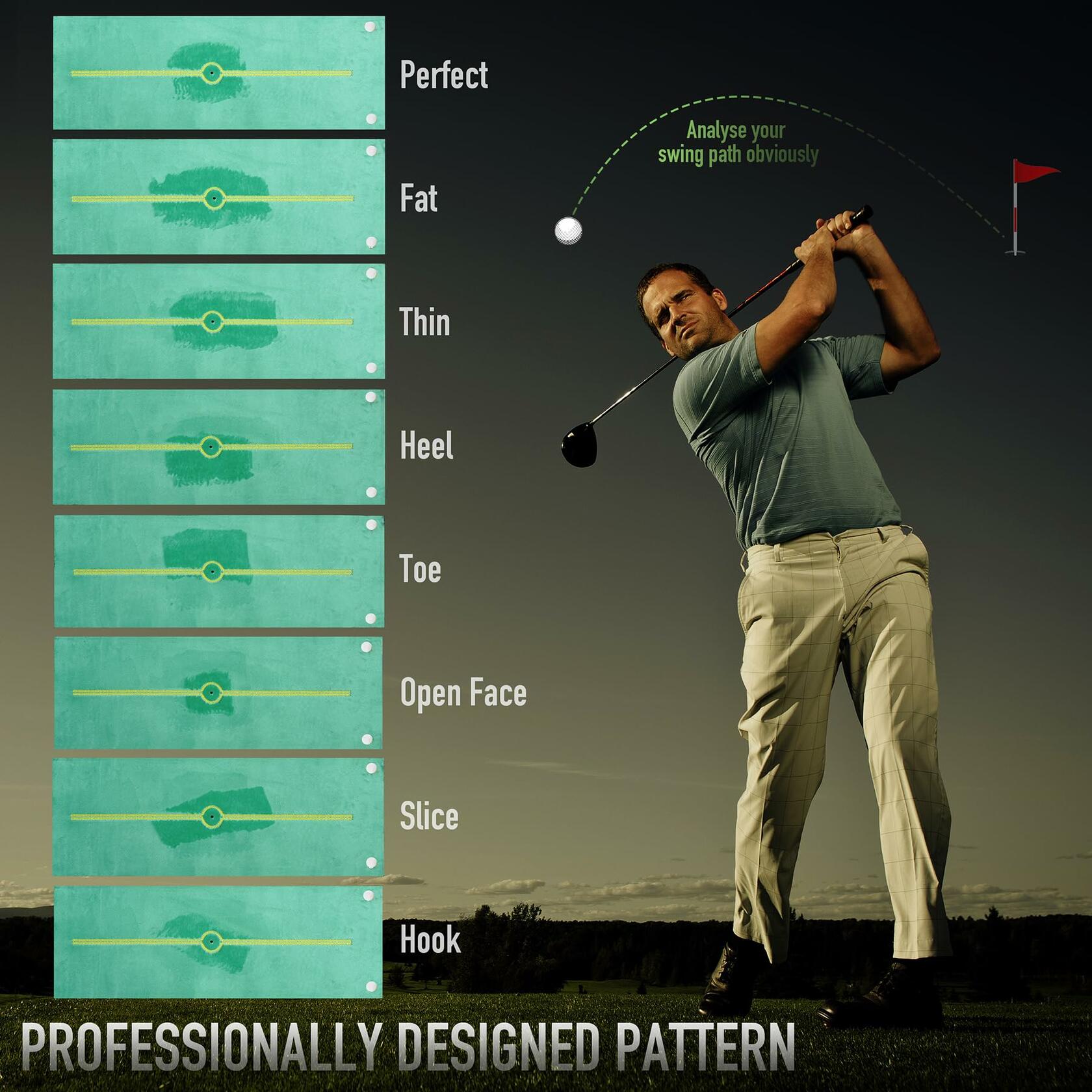 - 【Help Interpret Ball Flight & Swing Quality】The Golf Swing Path Record Mat can help interpret ball flight and swing quality by reading your swing path records to check toe heel height of the clubface through impact, and improves low-point consistency every practice session.
